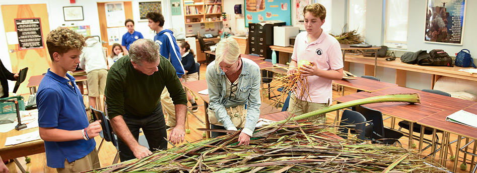 Recently, we enjoyed two very special events on campus that reminded us of Cushman’s aim to honor and incorporate the Arts…the appreciations that enrich one’s life, into our program. On Jan. 29th, our Middle School students began their week-long journey in the annual Artists-in-Residence Program. We warmly welcomed past Cushman Middle School art teacher and artist, Christina Painter, and sculptor, Dan Peterson. These professional artists facilitated students in the completion of ‘sculptures’ using materials sourced from our “Living Earth.” Students were engaged in this hands-on process that challenged them to ‘learn to see’, get into the moment and create relationships amongst materials that resulted in creatures (real or mythical) designed using palm fronds, coconuts, rocks, leaves, and other natural, found objects. This intensive exercise required vision, problem solving and an appreciation for the beauty in simple objects found daily in the environment. It’s so impressive to see how their teamwork, critical thinking skills and incredible imagination and creativity resulted in such moving works of art. Their collaborative projects were displayed at Gallery Walk, and boy, was it a “WOW!”